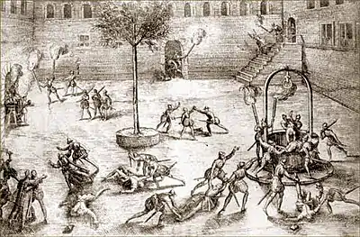 The Catholic Church in France and many of its members opposed the Huguenots. Some Huguenot preachers and congregants were attacked as they attempted to meet for worship.[38] The height of this persecution was the St. Bartholomew's Day massacre in August, 1572, when 5,000 to 30,000 were killed, although there were also underlying political reasons for this as well, as some of the Huguenots were nobles trying to establish separate centres of power in southern France. Retaliating against the French Catholics, the Huguenots had their own militia.[39]