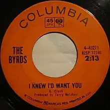 "I Knew I'd Want You" is a song by the folk rock band the Byrds, written by band member Gene Clark, and first released as the B-side to their 1965 debut single, "Mr. Tambourine Man".[1] It was also later included on their debut album, Mr. Tambourine Man.[2]