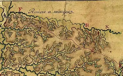 The Wolf River's watershed (everything above the red dotted line), as surveyed in 1740 by Ignace Francois Broutin, chief engineer of French Louisiana. The French had named the Wolf "Riviere a Margot"