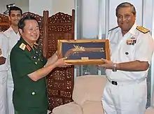 In 1992, India and Vietnam established extensive economic ties, including oil exploration, agriculture and manufacturing.[3] The relations between the two countries, especially defence ties, benefited extensively from India's Look East policy.[4] Bilateral military cooperation includes sale of military equipment, sharing of intelligence, joint naval exercises and training in counterinsurgency and jungle warfare.[5] India also regularly deploys its warships for goodwill visits to Vietnamese seas.