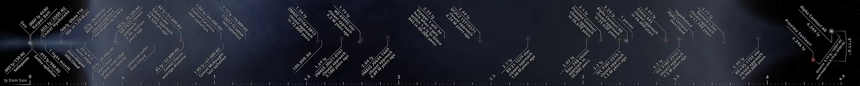 Schematic view to scale of known astronomical objects within 4.5 light years of the Sun. The Hills cloud is shown here as an aqua green line (cross-section of its torus shape).