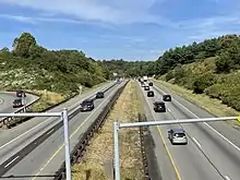 In March 2020, as a result of the COVID-19 pandemic,[15] the all-electronic tolling system on the turnpike will initially use existing toll booths at exits, along with existing equipment at all-electronic tolling interchanges, until mainline toll gantries between interchanges are constructed.[16] Mainline toll gantries are planned to be in operation by 2025.[17][18]