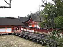 Shinto architecture has many distinct parts, most of which include the shrine's honden (main hall) and the unusually long haiden (main oratory), and its equally long heiden (offertory hall). The honden "is an eight-by-four bay structure with a kirizuma roof surfaced in cypress bark."[2] Its walls are decorated in white stucco; they were constructed using a process requiring fifteen coats of white stucco, with vermilion woodwork.[2]