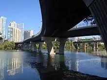 The James D. Pfluger Pedestrian and Bicycle Bridge is a shared use bridge for pedestrians and cyclists spanning Lady Bird Lake in downtown Austin, Texas. Opened in 2001, the bridge connects the north and south sides of the Ann and Roy Butler Hike-and-Bike Trail and features an unusual "double curve" design. The bridge runs parallel to the Lamar Boulevard Bridge, which carries road traffic across the lake roughly 200 feet (61 m) to the west.[1]