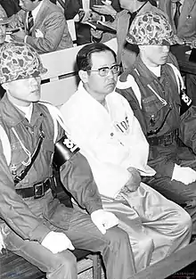 Instead, an emergency cabinet meeting was convened at which Choi Kyu-hah, the prime minister, was declared acting president with Jeong implementing martial law. He plotted to exclude political soldiers such as the Hanahoe, an influential group of South Korean military officers. The group later instigated the Coup d'état of December Twelfth. As a result, key members of the Hanahoe, such as Chun Doo-hwan and Roh Tae-woo, arrested Jeong on suspicion of involvement in the assassination of Park.[3][4]