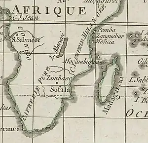 Following Leo Africanus, the works of Richard Hakluyt designate this population as "Cafars and Gawars, which is, infidels or misbeleeuers".[7][8] Hakluyt refers to slaves ("slaues called Cafari") and certain inhabitants of Ethiopia ("and they vse to goe in small shippes, and trade with the Cafars") by two different but similar names. The word is also used in allusion to a portion of the coast of Africa ("land of Cafraria").[9] On early European maps of the 16th and 17th centuries, Southern Africa northwest of the "Hottentots" (Khoikhoi) was likewise called by cartographers Cafreria.