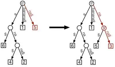 4. Add as a new leaf and connect it to the new internal node by an edge that is labeled . Thus the edge label consists of the remaining characters of suffix that are not already represented by the concatenation of the labels of the root-to- path.