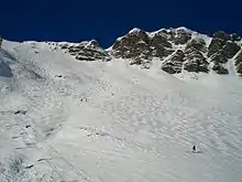 After the initial 50 metres, the slope widens to the left, allowing skiers and boarders to traverse to a less steep area and make their descent by curving around the more steep and dangerous path directly down the slope.