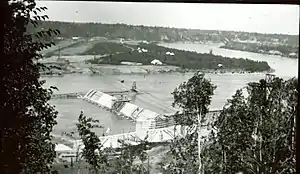 La Colle Falls Hydroelectric Dam is a partially complete hydroelectric dam built on the North Saskatchewan River near the city of Prince Albert, Saskatchewan. The dam is approximately 45 kilometres (28 mi) east of the city in an area that is quite accessible.[1] Construction started in 1909 and the partially completed project was abandoned in 1913 due to high costs and technical difficulties. The motivation of building the dam was to provide cheap power and attract business to the area.[2] The partially complete project had cost nearly $3 million and nearly bankrupted the city in the process.