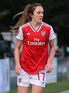 On 29 June 2017, Evans signed for Arsenal.[16] Due to injuries and competition for places in her usual playing position, coach Joe Montemurro sometimes deployed Evans as a full-back: "One week I find myself on the left wing and then the other I find myself at right-back but it's something I've really enjoyed. It's made me an all-around better player."[17] She extended her contract with the FA WSL club in December 2018.[18] During her first season with Arsenal in 2017–18, Evans played 18 regular season games, scoring two goals, went on to win the WSL Cup and was a Women's FA Cup finalist. Her second season with the club saw her play another 18 regular season games and help Arsenal to a runner-up position in the WSL Cup and finish as champions in the FA WSL. Evans played her 50th match with the club overall on 31 March 2019 against Birmingham City W.F.C.;[19] Arsenal won the game 1–0 and as a result qualified for the Champions League for the first time since 2014.