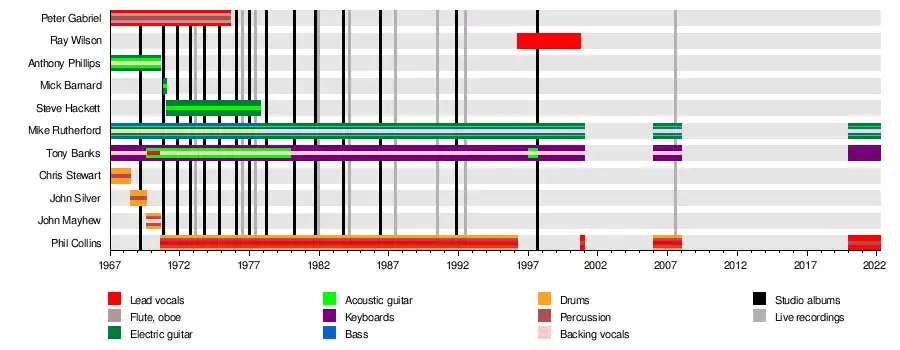 In August 1970, Phil Collins replaced John Mayhew on drums. When frontman Peter Gabriel left in 1975, Collins took over on lead vocals and live drums were handled primarily by touring musicians.