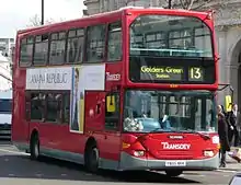 When re-tendered, route 13 was retained by London Sovereign with a new contract commencing on 31 August 2013. Wright Eclipse Gemini 2 bodied Volvo B5LHs were introduced on the same date.[9][10] In March 2015, Transport for London opened a public consultation on proposals to scrap the route.[11][12] The route was saved after intervention by Mayor of London Boris Johnson.[13][14] In September 2016, six Wright SRM bodied Volvo B5LHs entered service on the route.[15][16][17] In July 2016, under the tenure of new Mayor of London Sadiq Khan, TfL opened another consultation on proposals to extend the route to North Finchley and divert it to Victoria station replacing route 82.[18][19][20] This took effect on 1 April 2017 with it being operated by Tower Transit and becoming a 24-hour route.[21][22]