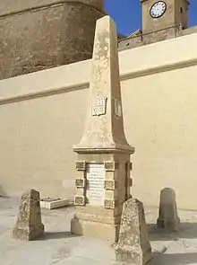 When the Gozo Aqueduct was built between 1839 and 1843, a water reservoir was constructed in the Cittadella's ditch.[24] A commemorative obelisk was also built near the reservoir.[25] A road leading from it-Tokk to the Cittadella was constructed in 1854, allowing easier access to the fortified city.[26] The Royal Malta Fencible Regiment moved its Gozo headquarters from the Cittadella to Fort Chambray in 1856, and the fortifications of the Cittadella were decommissioned by the British on 1 April 1868.[27] The Cittadella's fortifications and the ruined buildings within the city were included on the Antiquities List of 1925.[28] During World War II, air raid shelters were dug under the bastions of the Cittadella.[29]