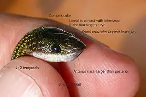 Snout much depressed; eye rather small. Rostral much broader than long, just visible from above; internasals much shorter than the prefrontals; frontal as long as or a little shorter than its distance from the end of the snout, a little shorter than the parietals; loreal elongate, not entering the eye; one pre-ocular; two post-oculars; temporals small, 1 + 2; 9 or 10 upper labials, third, fourth, and fifth entering the eye; 4 or 5 lower labials in contact with the anterior chin-shields, which are longer than the posterior.