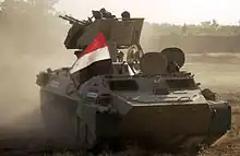 - MT-LB converted into a SPAAG by mounting a ZU-23-2 23×152mm twin anti-aircraft gun on the rear part of the vehicle. The gun had its wheels removed and as such cannot be easily dismounted and used separately. There were at least two variations of this conversion; one with the ZU-23-2 mounted in an open-topped turret, the other with the ZU-23-2 mounted on a platform extending beyond the hull of the MT-LB with a roof for the gun operators. The second version was most likely intended to be used in a fire support role, as the roof would hinder the gun's sights at high elevation.[13]
