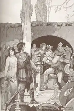 Culhwch and his companions at Ysbaddaden's court. Image by Ernest Wallcousins in "Celtic Myth & Legend", Charles Squire, 1920.