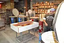 Just as early photographs show workers at Malibu Potteries,[10] usually women, applying glazes to bisque tile having resist patterns, modern ceramicists rely upon virtually the same technique. Tile with resist lines circulate on a Lazy Susan while 'glazers' use bulb syringes to squeeze the wet glaze onto the tile. Since unfired glaze does not necessarily look the same color as a fired glaze, a schematic is usually close by to identify where the appropriate glaze goes on the tile. Glazers with steady hands and a good attention span produce tiles with consistent edges and infrequent run-over.