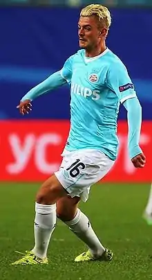 Lestienne in a 2015-16 UEFA Champions League starting XI for PSV: (from top left to right) Joshua Brenet, Davy Pröpper, Héctor Moreno, Jeffrey Bruma, Nicolas Isimat-Mirin and Jeroen Zoet.(from bottom left to right): Lestienne, Luciano Narsingh, Santiago Arias, Jorrit Hendrix and Adam Maher