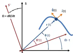 - ↑ Observational frames of reference and coordinate systems are independent ideas. A frame of reference is a physical notion related to the observer's state of motion. A coordinate system is a mathematical description, which can be chosen to suit the observations. A change to a coordinate system that moves in time affects the description of the particle motion, but does not change the observer's state of motion. For more discussion, see Frame of reference