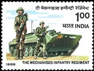 The Mechanised Infantry Regiment is an infantry regiment of the Indian Army, comprising 27 battalions dispersed under various armoured formations throughout India. Together with the 21 battalions of Brigade of the Guards, they form part of the Mechanised Infantry arm, which along with the Armoured Corps form the Mechanised Forces.[3]