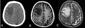 CT and MRI scans showing lesion of the right frontal lobe of the brain.[6]