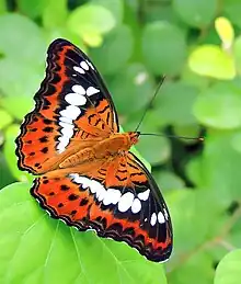 The commander has a wingspan of about 6 to 7.5 cm (2.4 to 3.0 in). The upperside of its wings are a bright reddish brown. Towards the centre of the wing are broad white spots. In flight, one can see a bright red brown butterfly with a white band forming a V shape. There are also a few white spots scattered on the wings. Its hindwings have crenulated margins. The undersides of the wings are a whitish grey toward the base and have a row of dull reddish brown and a row of black spots along the margins. The male and female are similar in appearance.[3][4]