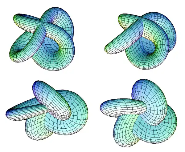Four different views of the Morin surface: the first two are shown with "passage barriers" cut out, the last two are views from the "bottom".