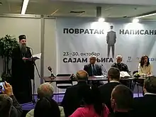 Stefan Lazarević became the Despot of Serbia in 1402, and he was succeeded by Đurađ Branković in 1427. A contemporary inscription on the recto of the first leaf of the psalter indicates that the book was part of Despot Đurađ's library,[10][12] and that, at some point, he sent it to one of his sons. It is conjectured that the book might have been a wedding gift for his youngest son and successor, Lazar Branković, who married in 1446.[12] The Serbian Despotate fell to the Ottomans in 1459, and the Branković family went into exile in Syrmia, then part of the Kingdom of Hungary. At the beginning of the 17th century, the psalter was in the Privina Glava Monastery on Mount Fruška Gora in Syrmia, which was then under Ottoman rule. In 1627, Serbian Patriarch Pajsije visited the monastery and took the manuscript to his library in Vrdnik, where it remained until 1630.[10][12] During that time, a copy of the psalter was transcribed; the miniatures were also copied. The patriarch then rebound the book and returned it to Privina Glava.[10][13] The copy, known as the Belgrade Psalter,[14] would be later kept in the National Library of Serbia. It was destroyed along with the library by the German bombing of Belgrade in April 1941.[9]
