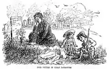 Four Victims of Cheap Patriotism (1910). Anti-war cartoon depicting a widow grieving the death of her husband alongside their children playing with a toy rifle and soldiers.