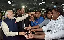Indian workers at the Larsen & Toubro residential complex in Riyadh receiving a visit from their Prime Minister Narendra Modi (far left) in April 2016