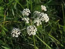 It flowers between June and September in northern Europe, with umbels of 5-9 smaller umbels about 1-2 cm in diameter, each of which has numerous white flowers. There are about 5 awl-shaped bracts on the main umbel and 5-7 small bracteoles at the base of each of the individual umbellules. Plants are monoecious, with hermaphroditic and male flowers in all umbels, but the proportion of hermaphroditic flowers decreases as the season progresses. Each flower has 5 unequal petals with the larger, outer ones slightly larger, 5 stamens and 2 prominent styles arising from a swollen base (stylopodium) at the top of the ovary. After flowering, the flower stalks do not expand (as they do in some other species of water-dropwort) and the umbels do not become flat-topped.[1][3]