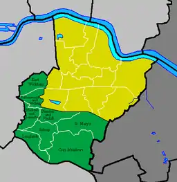 Wards of the Old Bexley and Sidcup constituency (green) within the London Borough of Bexley (yellow and green) from the 2010 general election