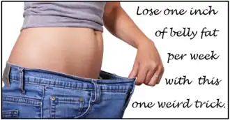 "One weird trick" (also "one simple trick") advertisements are a form of clickbait online advertising that has been common on the Internet since around the late 2000s. The formula used in the advertisements was first applied to weight-loss products, but has since been extended to cures for problems including hair loss and diabetes.[1][2] A Federal Trade Commission (FTC) investigation found that many of the advertisements sold "trial" packages that were never sent. The FTC filed legal action in 2011 against promoters of such advertisements for defrauding millions of people.[3][4]
