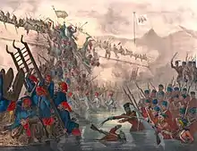 The Serbian revolution (1804–1815) marked the beginning of an era of national awakening in the Balkans during the Eastern Question. In 1811, the fundamentalist Wahhabis of Arabia, led by the al-Saud family, revolted against the Ottomans. Unable to defeat the Wahhabi rebels, the Sublime Porte had Muhammad Ali Pasha of Kavala, the vali (governor) of the Eyalet of Egypt, tasked with retaking Arabia, which ended with the destruction of the Emirate of Diriyah in 1818. The suzerainty of Serbia as a hereditary monarchy under its own dynasty was acknowledged de jure in 1830.[114][115] In 1821, the Greeks declared war on the Sultan. A rebellion that originated in Moldavia as a diversion was followed by the main revolution in the Peloponnese, which, along with the northern part of the Gulf of Corinth, became the first parts of the Ottoman Empire to achieve independence (in 1829). In 1830, the French invaded the Deylik of Algiers. The campaign that took 21 days, resulted in over 5,000 Algerian military casualties,[116] and about 2,600 French ones.[116][117] Before the French invasion the total population of Algeria was most likely between 3,000,000 and 5,000,000.[118] By 1873, the population of Algeria (excluding several hundred thousand newly arrived French settlers) decreased to a drastic 2,172,000.[119] In 1831, Muhammad Ali of Egypt revolted against Sultan Mahmud II due to the latter's refusal to grant him the governorships of Greater Syria and Crete, which the Sultan had promised him in exchange for sending military assistance to put down the Greek revolt (1821–1829) that ultimately ended with the formal independence of Greece in 1830. It was a costly enterprise for Muhammad Ali, who had lost his fleet at the Battle of Navarino in 1827. Thus began the first Egyptian–Ottoman War (1831–1833), during which the French-trained army of Muhammad Ali, under the command of his son Ibrahim Pasha, defeated the Ottoman Army as it marched into Anatolia, reaching the city of Kütahya within 320 km (200 mi) of the capital, Constantinople.[120]: 95 In desperation, Sultan Mahmud II appealed to the empire's traditional arch-rival Russia for help, asking Emperor Nicholas I to send an expeditionary force to assist him.[120]: 96 In return for signing the Treaty of Hünkâr İskelesi, the Russians sent the expeditionary force which deterred Ibrahim Pasha from marching any further towards Constantinople.[120]: 96 Under the terms of the Convention of Kütahya, signed on 5 May 1833, Muhammad Ali agreed to abandon his campaign against the Sultan, in exchange for which he was made the vali (governor) of the vilayets (provinces) of Crete, Aleppo, Tripoli, Damascus and Sidon (the latter four comprising modern Syria and Lebanon), and given the right to collect taxes in Adana.[120]: 96 Had it not been for the Russian intervention, Sultan Mahmud II could have faced the risk of being overthrown and Muhammad Ali could have even become the new Sultan. These events marked the beginning of a recurring pattern where the Sublime Porte needed the help of foreign powers to protect itself.[120]: 95–96