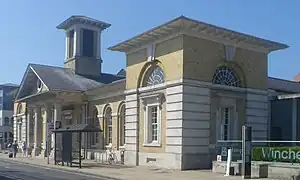 His buildings in Winchester included the New Corn Exchange (now a public library),[8] with a central portico modelled on that of Inigo Jones' St Paul, Covent Garden.[1] Describing the front of the building, The Gentleman's Magazine said that Carter had "endeavored to avoid the flimsy effect of the modern Grecian school, and to keep in view the more legitimate style of design inculcated by Palladio in Italy, and at home by our own countrymen, Jones and Wren."[9] In 1845 he restored the Great Hall of the Royal Palace at Winchester, renewing the stonework of the parapet and gables, and the plate tracery in the windows, removing the late 18th-century wooden window frames, and replacing the Georgian brick porch with one of a Gothic design. [8]