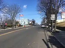 The route briefly forms the border between the borough of Hatboro to the east and Upper Moreland Township to the west before fully entering Hatboro past the Newington Drive intersection. Here, PA 263 heads north prior to turning northeast and intersecting Horsham Road.[3] At this point, the route crosses the Pennypack Creek and heads into downtown Hatboro as a three-lane road with a center left-turn lane.[3][4] The route turns north at Byberry Road and becomes North York Road at the Moreland Avenue intersection before it comes to a junction with the western terminus of PA 332 (East Montgomery Avenue).[3] After intersecting Summit Avenue, PA 263 leaves the downtown area and continues north, passing residential areas with a few businesses. Further north, the route widens into a four-lane undivided road.[3][4]