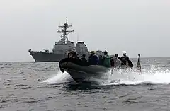 Since 2004, the Navy's deployment took place in Indian Ocean, playing a crucial role in the multinational NAVCENT in Bahrain, and took the leadership of the CTF-150 and CTF-151 as well as taking active participation in the Operation Enduring Freedom in 2006–10.[79][80][81] In 2008, the task force group consisting of PNS Badr, PNS Shah Jahan, PNS Nasr, and the Pakistan Air Force's Explosive Ordnance Disposal participated in the Exercise Inspired Union with the U.S. Navy in the Indian Ocean to develop skills in a prevention of seaborne terrorism.[82]