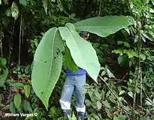 Passiflora macrophylla, commonly called the tree passion flower, is one of the relatively few species in Passiflora with a tree-like growth pattern (growing to 10–20 ft). The leaves can grow up to three feet long by one foot wide. Flowers are borne as inflorescences from the trunk as the plant does not often branch. The flowers have white petals and a yellow corona. Rounded fruits follow and may reach 2 in (5.1 cm) in diameter. It is native to humid and wet lowland regions of Ecuador with one collection reported from Colombia.