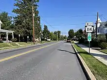 When Pennsylvania legislated routes in 1911, the portion of present-day PA 114 east of current PA 382 was designated as part of Legislative Route 250, which ran between York and the Harrisburg area. By this time, the current route east of Mechanicsburg was an unpaved road, with a small paved section to the west of the Yellow Breeches Creek.[5] PA 114 was designated in 1928 to run from US 11 in Hogestown south and east to Lisburn, where an unnumbered, unpaved road continued east to PA 24 (now PA 382). The present-day route east of there was designated as the northernmost part of PA 24, which reached its northern terminus at US 111 (Old York Road) in New Market. At this time, the entire length of PA 114 along with this section of PA 24 was paved.[6] By 1930, the road between Wertzville and Hogestown was an unnumbered, unpaved road.[7] In the 1930s, the unnumbered roads between Wertzville and Hogestown and Lisburn and PA 24 were paved.[8] PA 114 was extended east from Lisburn to PA 24 in the 1940s.[9] In the 1950s, the northern terminus of PA 24 was cut back to an interchange with I-83/US 111 southwest of New Market, resulting in the road between I-83/US 111 and Old York Road becoming unnumbered.[10] The eastern portion of PA 114 was extended north from PA 382 to Old York Road in New Market in the 1960s, replacing that portion of PA 24.[11] In the 1970s, the route was extended north from US 11 in Hogestown to PA 944 in Wertzville, with an interchange at I-81; the portion of the road between I-81 and US 11 was widened into a divided highway.[12]