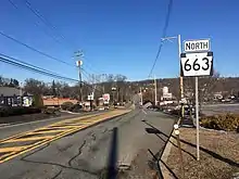 PA 663 was once part of the Steinsburg and Milford Square Turnpike. The turnpike was chartered in March 1858.[6] When Pennsylvania legislated routes in 1911, what is now PA 663 was not given a number.[7] PA 663 was designated in 1930 to run from in U.S. Route 422 (US 422, High Street) in Pottstown north to PA 73 in New Hanover Township. At this time, the entire length of the route was paved, along with the unnumbered road between PA 73 and Quakertown.[2] In 1936, PA 663 was extended north to an intersection with US 309 (now PA 309) and PA 212 (now PA 313) in Quakertown. The route followed its current alignment between PA 73 and Pennsburg before it followed Quakertown Road and Sleepy Hollow Road to Spinnerstown, where it turned east and followed Spinnerstown Road and Milford Square Pike to Quakertown.[8] By 1967, the southern terminus of PA 663 was rerouted to PA 100 in Pottstown, heading west on King Street.[9] In the 1960s, PA 663 was shifted from Milford Square Pike to a new alignment to the north between the Pennsylvania Turnpike Northeast Extension and Quakertown.[10] After construction began in 1973, a new alignment of PA 663 to the south from Pennsburg to the Pennsylvania Turnpike Northeast Extension opened a year later, with the route moved off Quakertown Road, Sleepy Hollow Road, and Spinnerstown Road.[11][12]