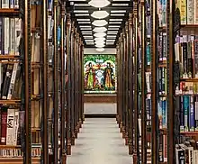 In 2006, the Pequot Library invested in a restoration project to address the condition of the elaborate metalwork set throughout their library stacks. Robert Robertson designed each shelf in the library to be supported by cast iron structures. Each row of shelving is framed by columns and the stairways linking the two stories are made with balusters of garlands and vines in copper-plated cast iron. During the course of restoration, over 6,000 metal pieces were individually treated. The project was carried out by Howard Newman's restoration company Newmans’ Ltd.[12][13] The most recent restoration of the Library which occurred in 2020 and 2021, when the original signature terra cotta roof tiles from 1894 had replacements installed from the original manufacturer, Ludowici Roof Tile.[14][15] The project included structural repairs and waterproofing the entire original structure and was funded to the amount of $1.6 million by the community and several grants.[16]