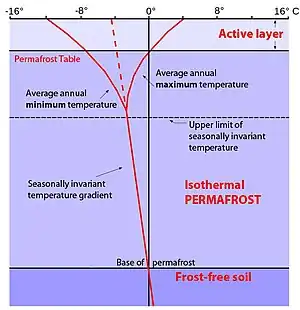 Permafrost temperature profile. It occupies the middle zone, with the active layer above it, while geothermal activity keeps the lowest layer above freezing. The vertical 0 °C or 32 °F line denotes the average annual temperature that is crucical for the upper and lower limit of the permafrost zone, while the red lines represent seasonal temperature changes and seasonal temperature extremes. Solid curved lines at the top show seasonal maximum and minimum temperatures in the active layer, while the red dotted-to-solid line depicts the average temperature profile with depth of soil in a permafrost region.