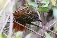 The Peruvian treehunter (Thripadectes scrutator) is a species of bird in the Furnariinae subfamily of the ovenbird family Furnariidae. It is found in Bolivia and Peru.[2] It is also called the rufous-backed treehunter[3] or buff-throated treehunter.[4]