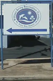 Directional sign pointing to the front gate of Pililaau Army Recreation Center.