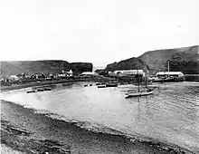 Popof Island first appeared as a separate political entity on the 1890 U.S. Census with a population of 146. Of these, 135 were White, 7 were Creole (Mixed Russian & Native), 3 were Asian and 1 was Native.[4] This included 3 settlements on the island: Pirate Cove (a codfishing Station), which had previously appeared on the 1880 census separately with 7 residents (all White), located on the northeast side of the island;[5] Red Cove (a fishing station) on the south side of the island; and Sand Point Station on the northwestern side of the island. Census enumerators also counted all the ships that were docked at Pirate Cove (including schooners Trapper and Unga) and those at Sand Point (including schooners Alexandria, City of San Diego, James Hamilton, Kate and Annie, San Diego, C.N. Smart & C.H. White).