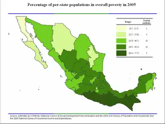 The concentration of poverty and distribution of wealth and opportunities is clearly visible from a geographic perspective.[60] The northern region of the country offers higher development while the southern states are the most impoverished. This is clearly the result of states equipped with better infrastructure that others. The states of Chiapas, Oaxaca, and Guerrero are among the least developed in the country. These states hold the highest numbers of indigenous population. As a result, 75 percent of the indigenous population lives on moderate poverty line and 39 percent of these under extreme poverty.[61]