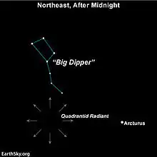 The Quadrantids (QUA) are a meteor shower that peaks in early January and whose radiant lies in the constellation Boötes. The zenithal hourly rate (ZHR) of this shower can be as high as that of two other reliably rich meteor showers, the Perseids in August and the Geminids in December,[4] yet Quadrantid meteors are not seen as often as those of the two other showers because the time frame of the peak is exceedingly narrow, sometimes lasting only hours. Moreover, the meteors are quite faint, with mean apparent magnitudes between 3.0 and 6.0.