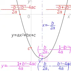 Each of these two solutions is also called a root (or zero) of the quadratic equation. Geometrically, these roots represent the x-values at which any parabola, explicitly given as y = ax2 + bx + c, crosses the x-axis.[2]