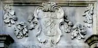 | Granville: Gules, three clarions or. For George Granville, 1st Baron Lansdowne of Bideford (1666-1735), nephew of John Granville, 1st Earl of Bath (1628–1701) and heir male of William Henry Granville, 3rd Earl of Bath (1692-1711).[45] It is the only escutcheon with heraldic supporters, generally reserved for use by nobility, here Two winged griffins rampant or. Above the escutcheon is a baron's coronet. He is identifiable by the style of his coronet and by his motto, shown inscribed on a scroll below: Deo, Patriae, Amicis[46] ("For God, my Country and Friends"), the motto of his uncle John Granville, 1st Earl of Bath having been: Futurum invisibile ("The future is unseen").[47] The arms are not those of John Granville, 1st Earl of Bath (1628–1701), or of his son Charles Granville, 2nd Earl of Bath (1661–1701). The latter's son William Granville, 3rd Earl of Bath (1692-1711) died aged only 19 two years before the building was completed in 1713. | ||||