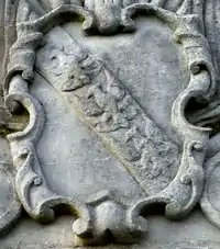 The inscription was transcribed by the Devon topographer Rev. John Swete (d. 1821) in his "Journals".[16] On the sides of the base of the statue are identical heraldic escutcheons showing the arms of Robert Rolle impaling the arms of Duke, Per fesse argent and azure, three chaplets counterchanged, for his wife Elizabeth Duke (d. 1716), daughter of Richard Duke (1652–1733),[17] MP, of Otterton, Devon.